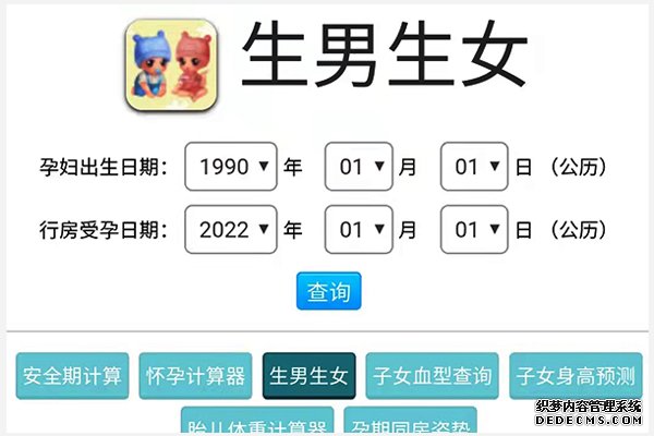女性怀孕后总想预测胎儿性别,想提前知晓是男孩还是女孩,在网络上有在线免费算生男生女计算器,只需要输入孕妇出生日期、同房受孕日期后,系统会自动计算出孕妇的虚岁和农历月份,然后通过与清宫图生男生女表等进行信息比对,得出生男孩还是生女孩的预测结果,其结果数据并不能保证真实性,仅供参考而已。