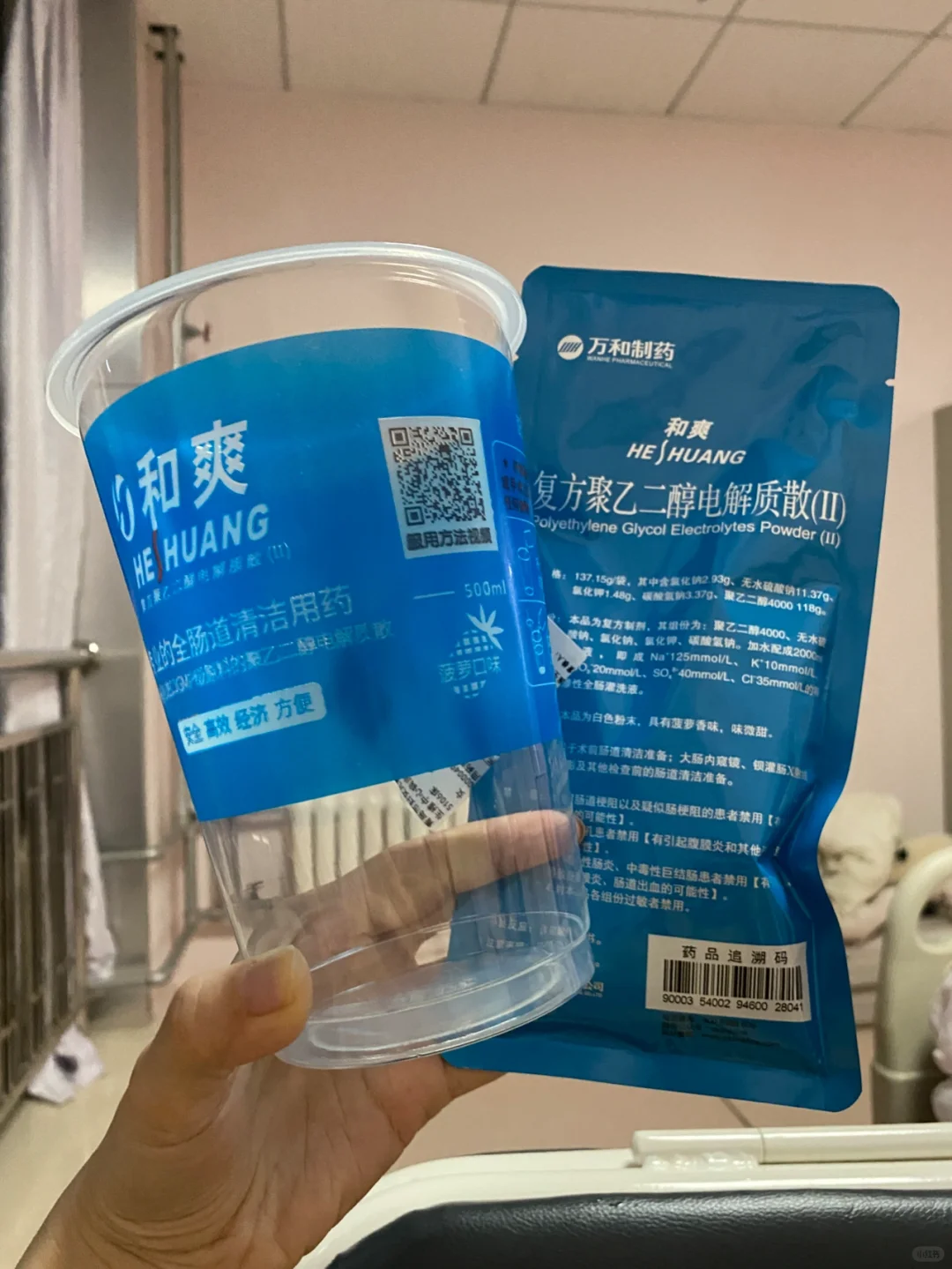术前一晚,要喝2L聚乙二醇(清肠道的)。这个对我来说太痛苦了,虽然说味道不难喝,但是量多啊?可能是喝的太着急了,中途吐了两次。姐妹们喝的时候可以慢点喝➕慢走,应该会好一些。