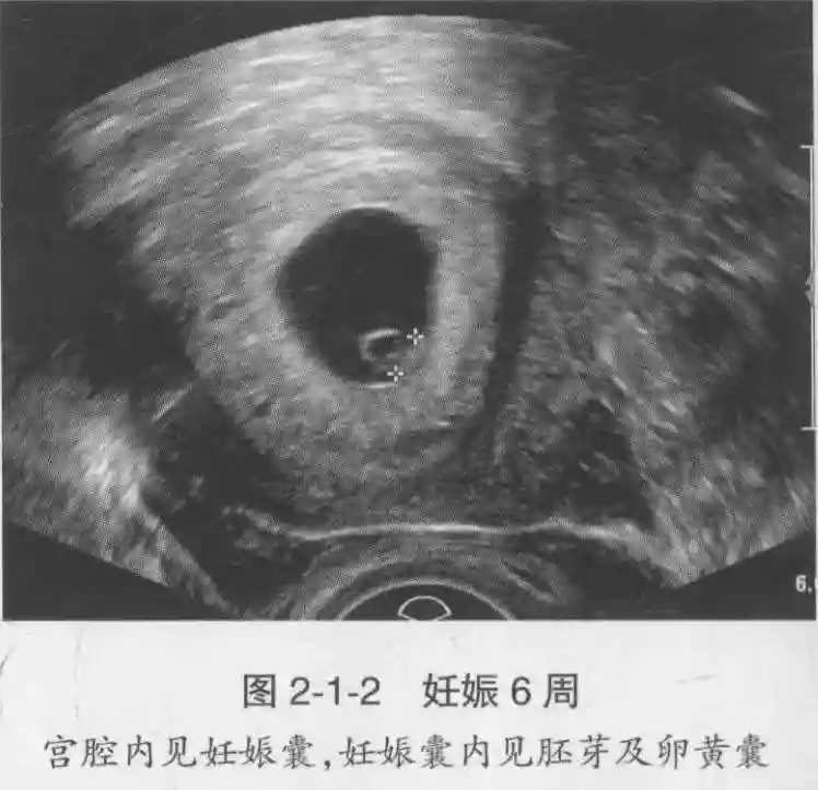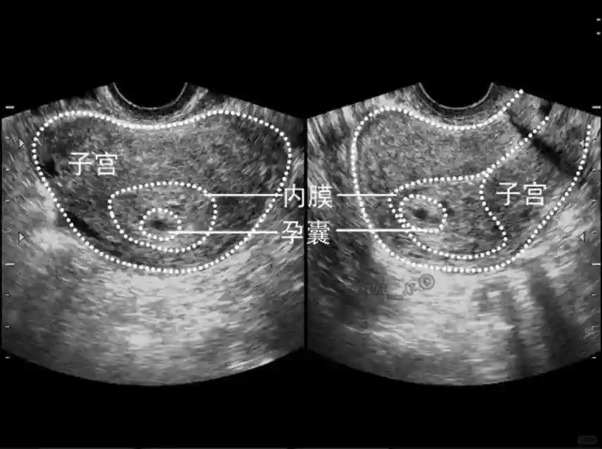 1️⃣妊娠囊:早期妊娠囊:正常妊娠囊位于宫腔上段,表现为宫腔内圆形或椭圆形的无回声区,周边为完整的、厚度均匀的强回声环,强回声环厚度≥2mm,强回声是妊娠绒毛的回声,随着妊娠囊的增大,形成特征性的“双环征” ,10周以后消失。正常的妊娠囊增长速度是平均 1 mm /d。