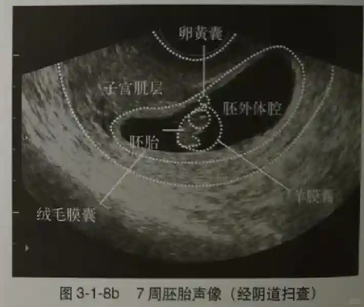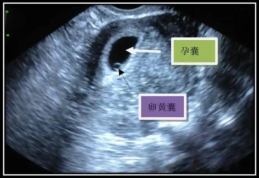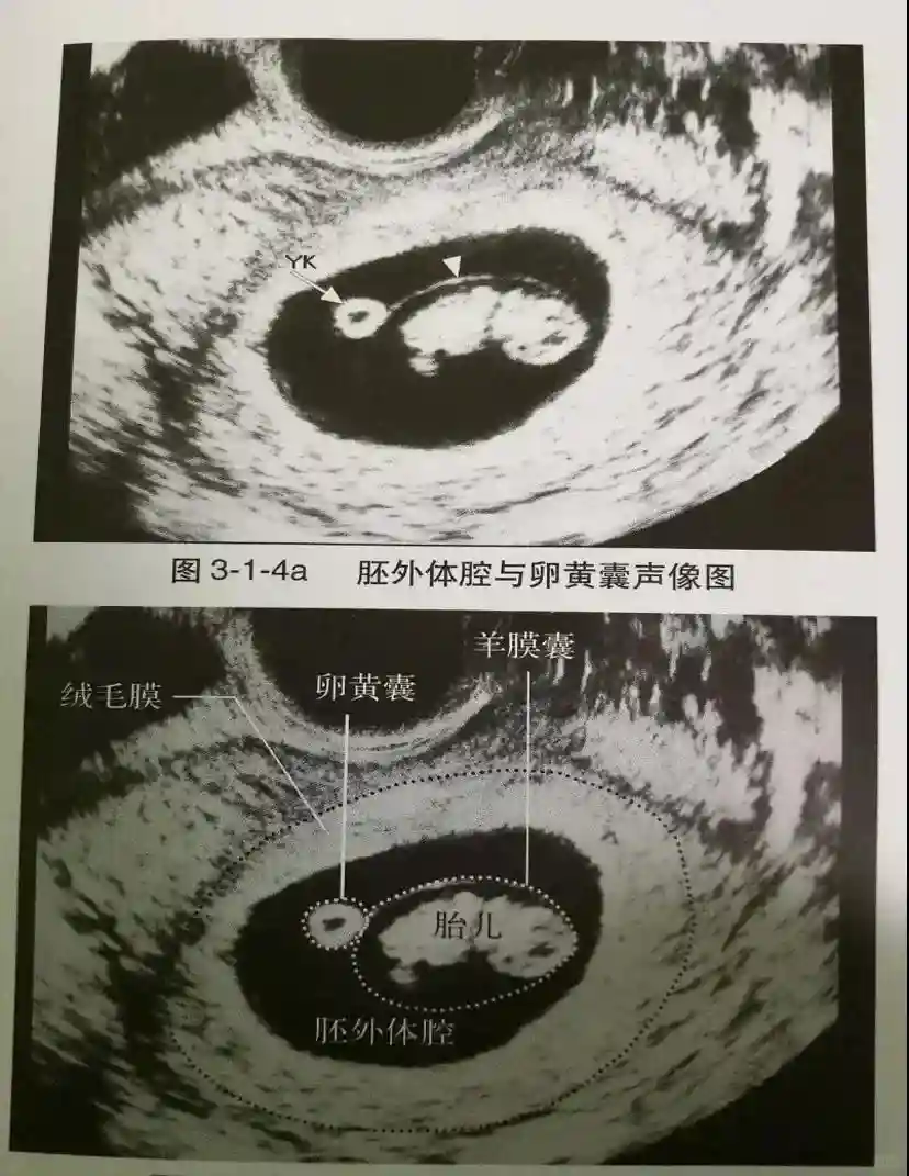 2️⃣卵黄囊:是妊娠囊内第一个解剖结构,直径<7mm。表现为小环状,中央为无回声,囊壁薄,内透声好。卵黄囊位于胚胎旁胚外体腔内。卵黄囊通常在孕5-6周时出现,5-10周稳步增长,一般不超过7mm,至12周消失。妊娠囊的大小与卵黄囊之间有一定关系,妊娠囊平均直径> 8 mm 时,经阴道超声均应显示卵黄囊,妊娠囊平均直径> 18 mm 时,经腹超声均应显示卵黄囊。