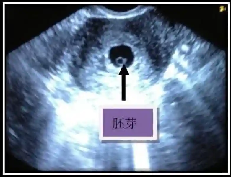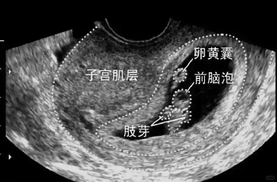 3️⃣胚胎:胚胎通常在6-7周时可以为超声显示,起初为胎芽,表现为卵黄囊一侧局部组织增厚,达到1 -2 mm 时才有可能为超声测量出来。达4-5mm时可见胎心搏动,相应孕周为6-6.5周,妊娠囊大小为13-18mm。胚芽长度≥7㎜时仍未见心管搏动,提示胚胎停止发育。胚胎的出现和妊娠囊直径的关系:妊娠囊直径> 16 mm 时,经阴道超声应显示胚胎。妊娠囊直径> 25 mm 时,经腹超声均应显示胚胎。